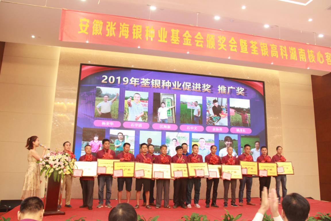 ??? 2019年8月3-4日,安徽荃銀高科湖南營銷公司核心客戶研討峰會暨張海銀種業基金會荃銀種業促進獎頒獎儀式在湖南長沙隆重召開。湖南省種子管理站站長李穩香、湖南省種子協會副會長兼秘書長閔軍、安徽荃銀高科種業股份有限公司常務副總經理、營銷總監王玉林、安徽張海銀種業基金會秘書長張彤、荃銀高科監事會主席謝慶軍、荃銀高科工會主席鄭滿生、中化現代農業MAP事業部技術總監徐伯陽、中化MAP糧作部、中化化肥、先正達各省區的總經理和荃銀高科分子公司等單位領導以及來自湖南省的160多位種業精英們參會。