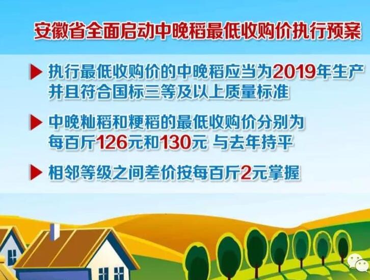 ??? 近日,從省政府新聞辦舉行的新聞發(fā)布會上了解到,從現(xiàn)在開始到2020年1月31號,安徽省全面啟動中晚稻最低收購價執(zhí)行預案,執(zhí)行最低收購價的中晚稻應當為2019年生產(chǎn)并且符合國標三等及以上質(zhì)量標準,中晚秈稻和粳稻的最低收購價分別為每百斤126元和130元,與去年持平,相鄰等級之間差價按每百斤2元掌握。